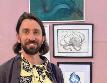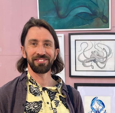 Cornish artist creating meditative pointillistic marine animals, illustrated teacups full of Cornish landscapes, and vibrant experimental landscapes. Former secret sketcher, now creating calm through thousands of patient marks.