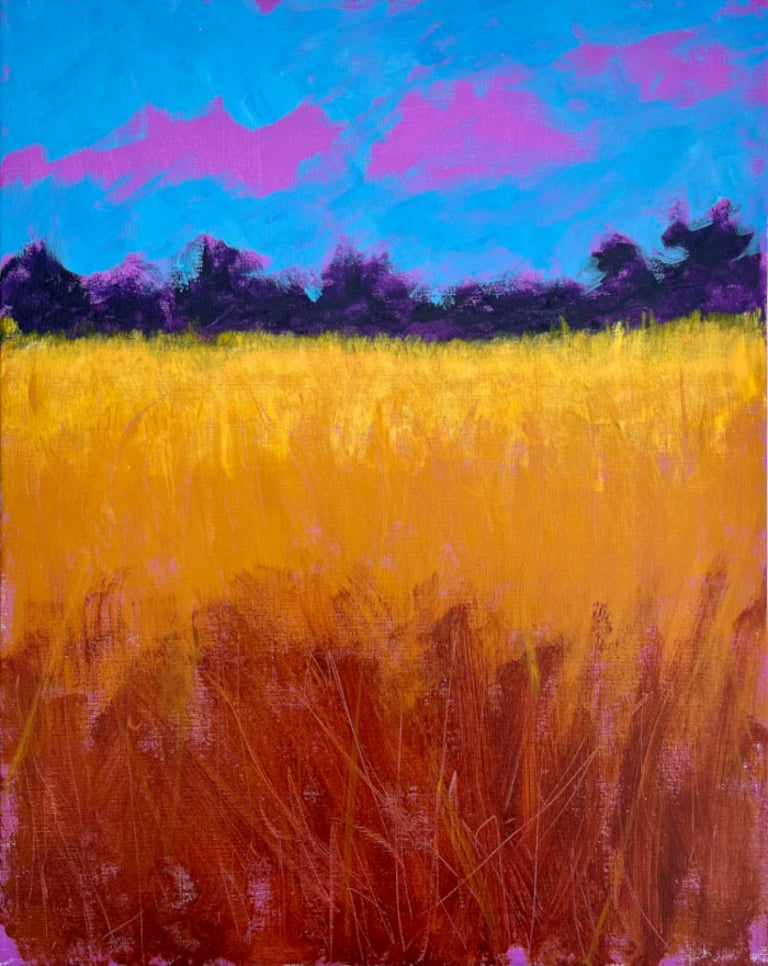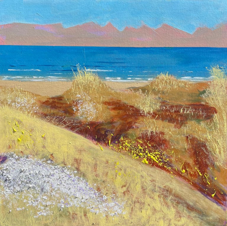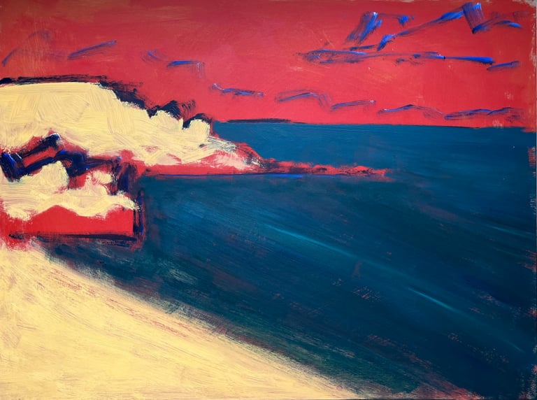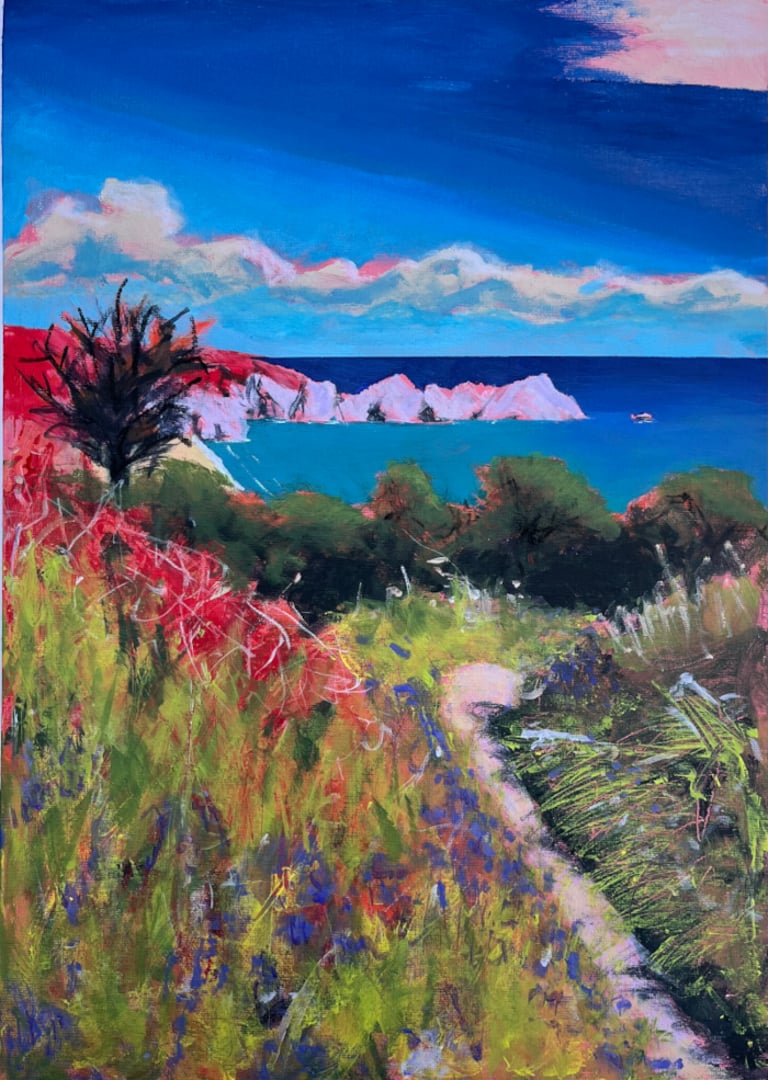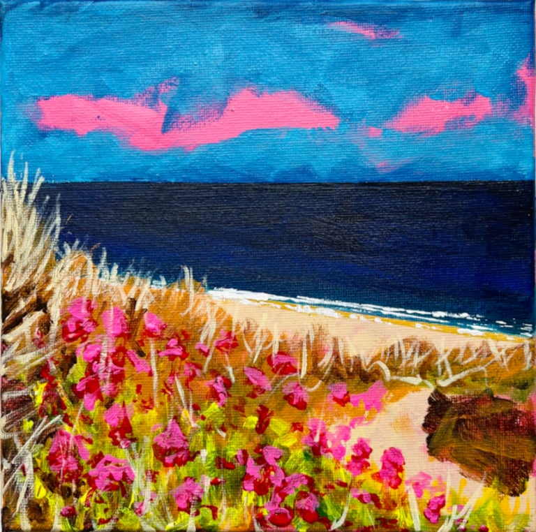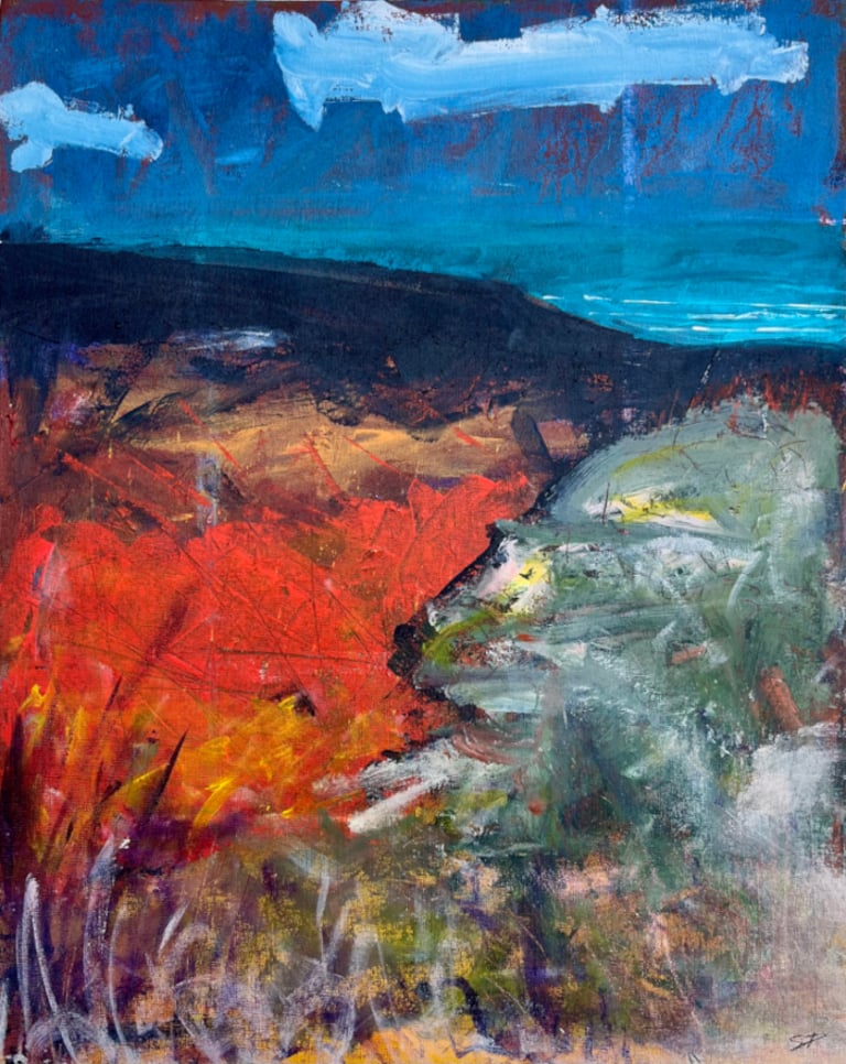 My landscape paintings are looser and more experimental. They come from cycling quiet lanes and walking coastal paths around Cornwall, where beautiful views appear unexpectedly. Painting lets me revisit these places and extend those journeys in my memory.