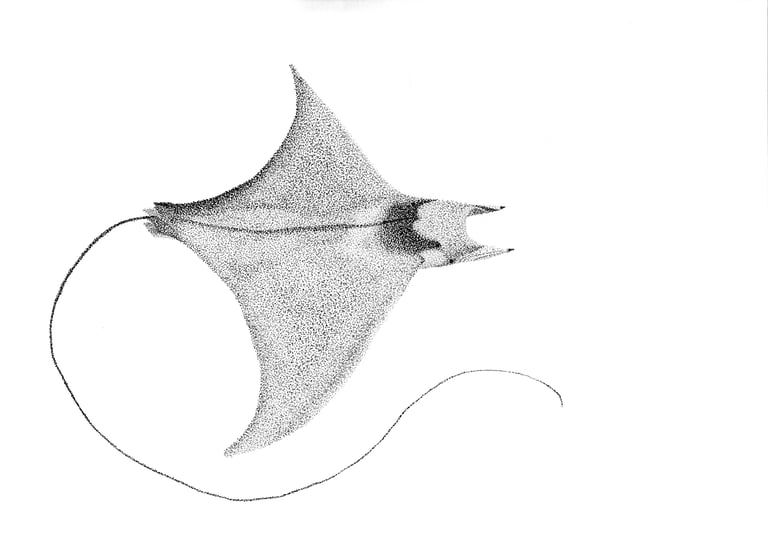 I create detailed black and white drawings of marine animals using thousands of individual dots. Each mark requires complete focus, which quiets my mind in our constantly connected world. The process feels similar to floating in Cornish waters—peaceful and present. The repetitive dot work becomes a meditation, and time disappears while I'm creating.